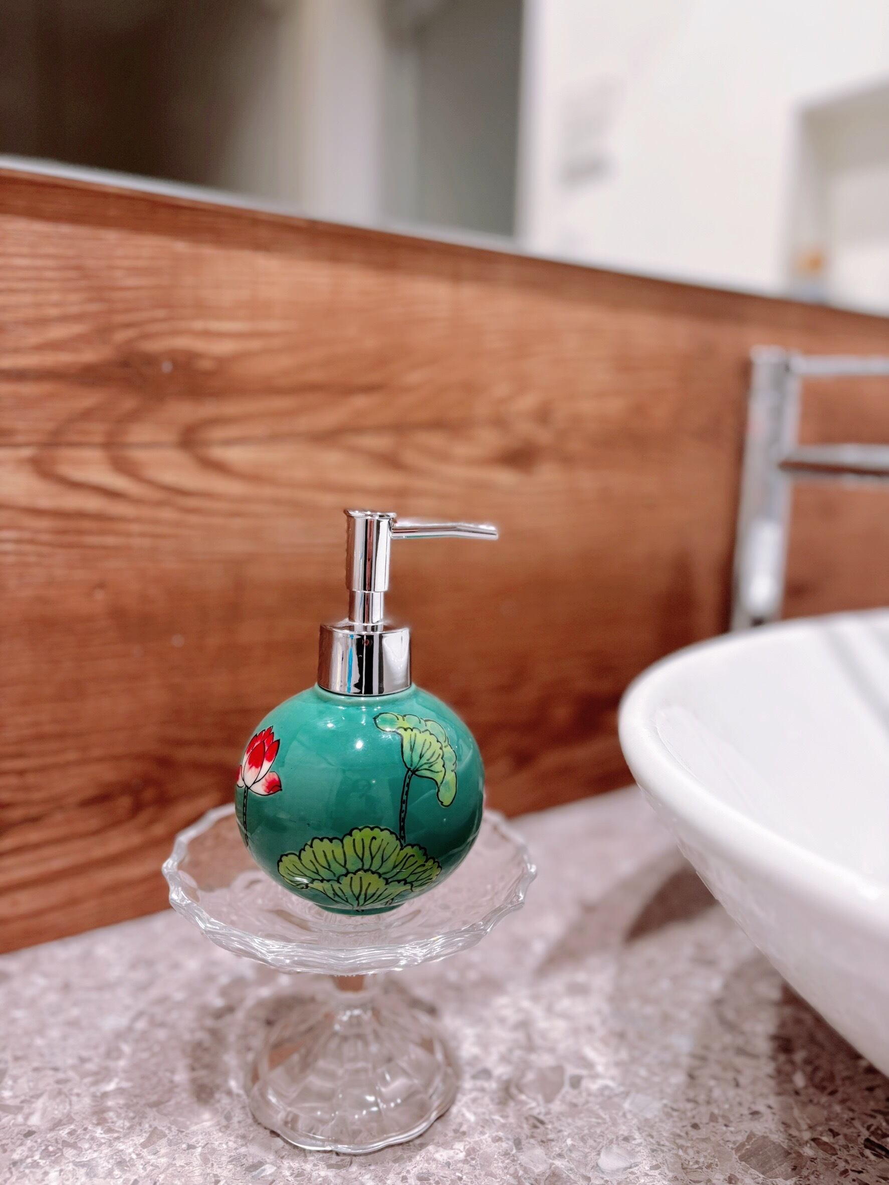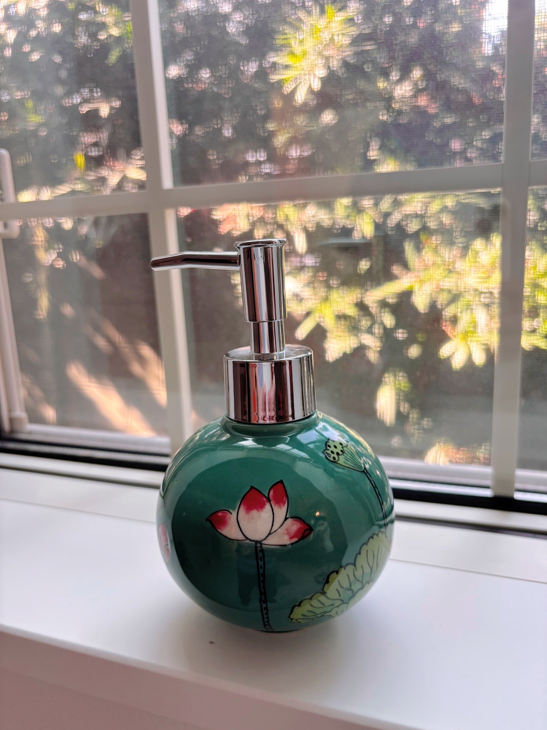 ベトナムで出会ったバッチャン焼きのソープディスペンサー。蓮の花と実が描かれたグリーンが美しく描かれています。